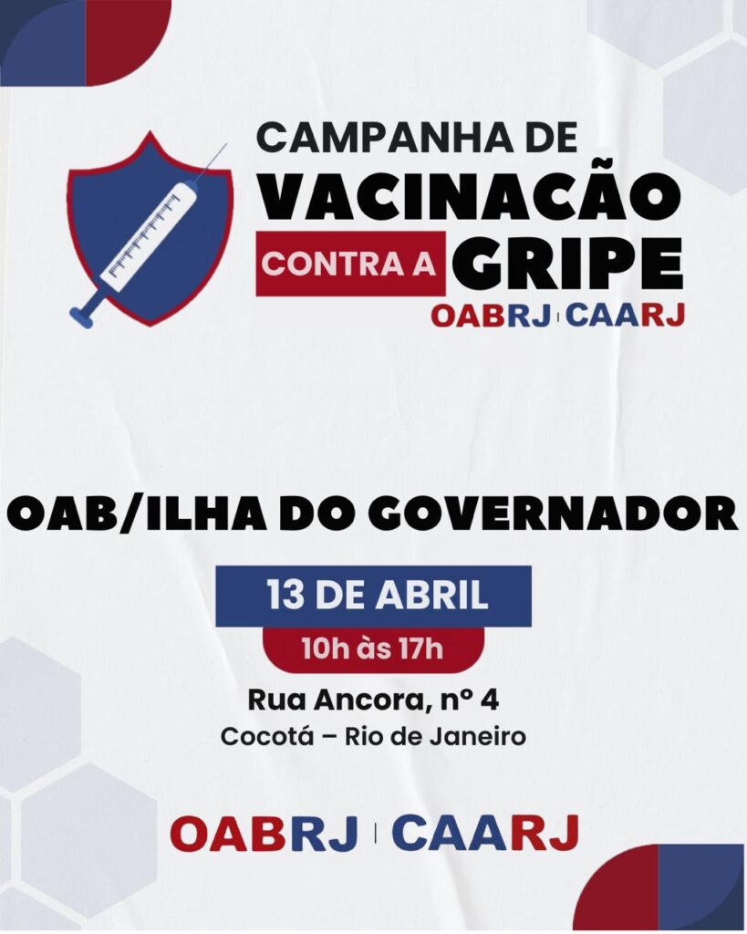 A OAB Ilha do Governador, por meio do presidente Dr. Franklin Barretto, em parceria com a CAARJ, convida você e sua família para a Campanha de Vacinação Contra a Gripe, que acontecerá no dia 13/04/2026 , das 10h às 17h, na nossa Subseção: